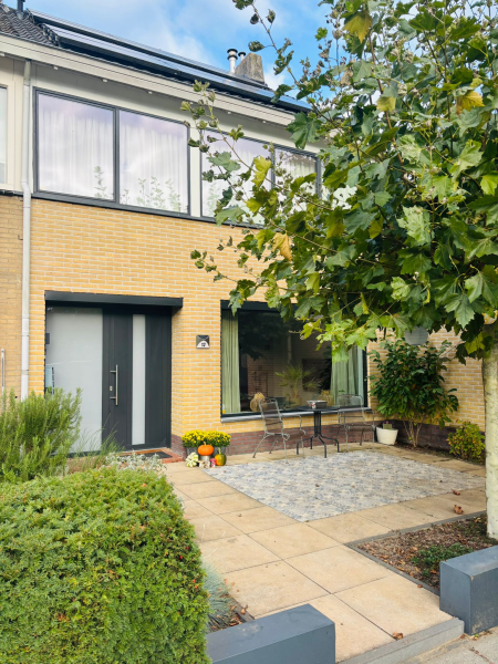 De fraai aangelegde achtertuin biedt volop privacy. Een absolute meerwaarde van deze woning is het vrijstaande bijgebouw in de tuin: een volledig ingericht guesthouse met eigen voorzieningen. Dit bijgebouw beschikt over een comfortabele woonkamer, een aparte slaapkamer, een eigen keuken en een badkamer met douche en toilet. Perfect voor logees, een au pair of als zelfstandige werkruimte aan huis.